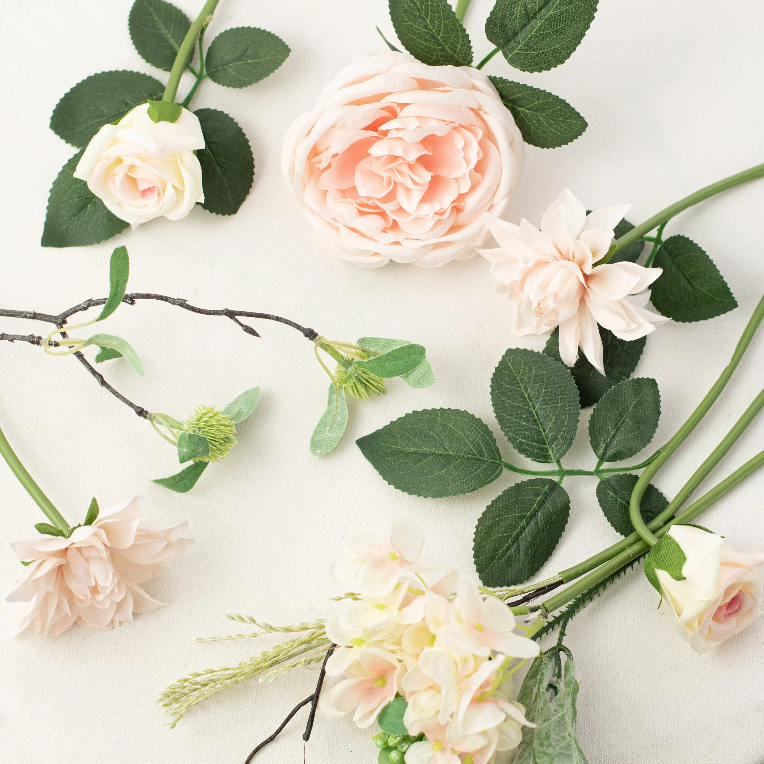 This pretty bouquet has eight separate stems with blush-pink dahlias, cream-to-blush ombré roses and hydrangea, and wispy greenery. Put in a vase for a ready-made centerpiece or use as romantic bridesmaid bouquets.