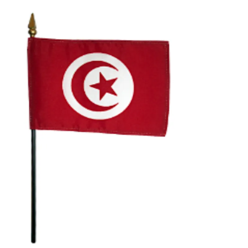 4 inch by 6 inch nylon flag with sewn edges, mounted on a 10 inch black plastic staff with gold-look spear tip. Price is per stick flag, base is not included.