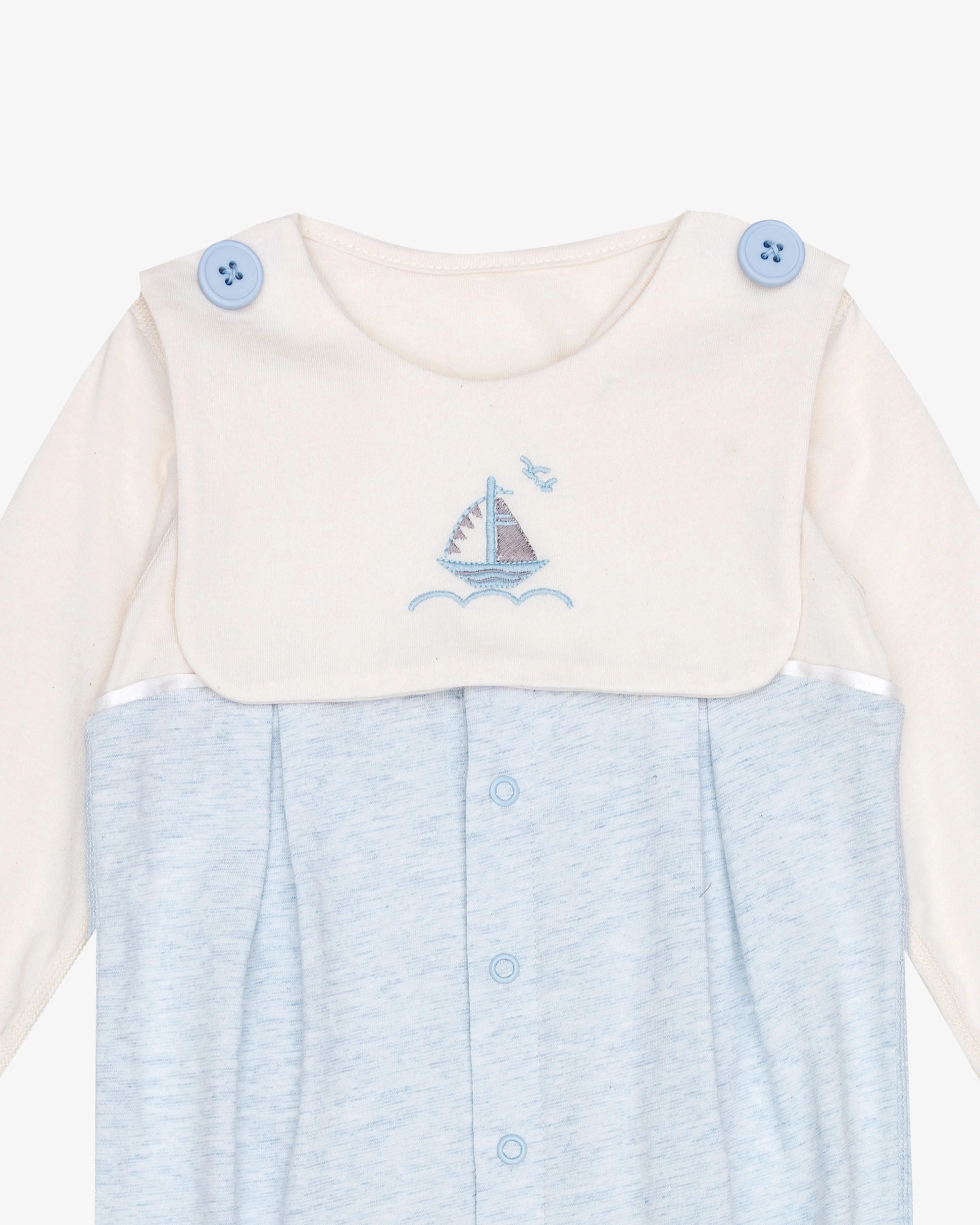 This romper is from our Sail Boat Collection, which has seagulls and sail boat. The design at the back and the buttons at the top of this romper can make your baby looks like a sailor when wearing it.
