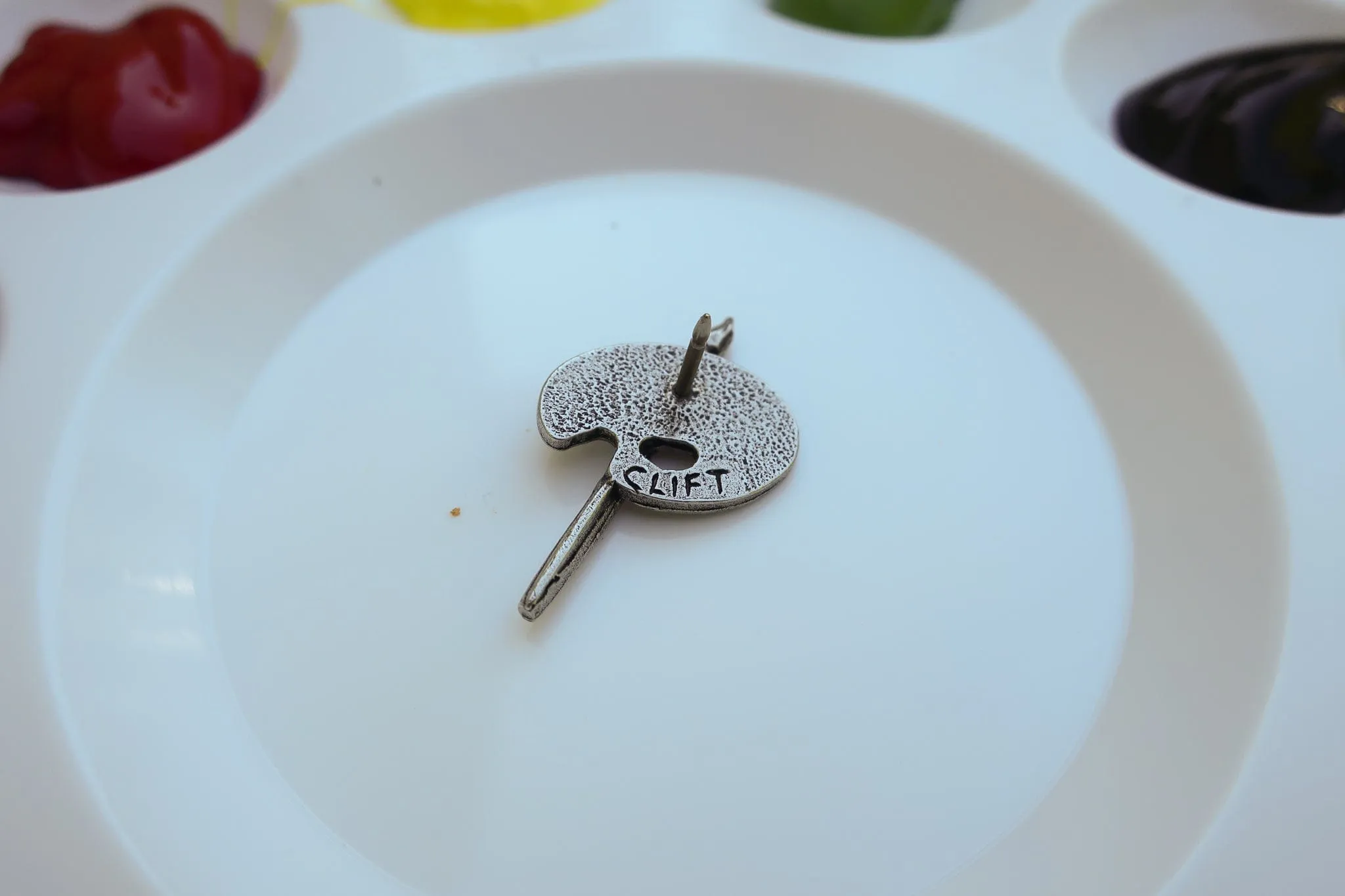 Wear our artist palette pin to inspire creativity. Hand cast in solid, lead free pewter, our art pins will stand out on a shirt, coat, lanyard, or art smock. Our painting pins arrive packaged on our signature presentation card, making them ready for gift-giving! Hosting a paint night, art camp, or artistic event? Our custom card option allows you to design the front of the card to include a logo, information about your event, or a special message.