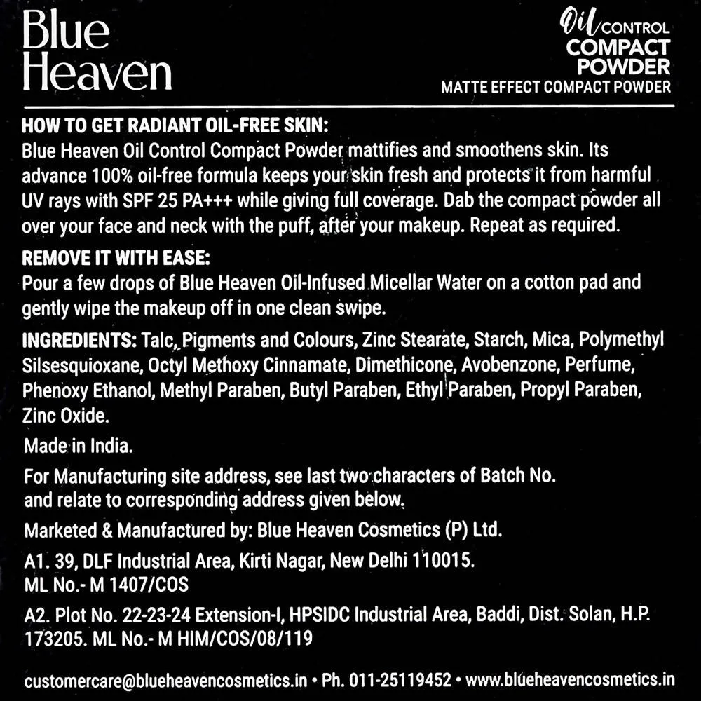 Blue Heaven Oil Control Compact mattifies and smoothens skin. With even coverage and SPF 40 PA , it protects your skin. Its advanced oil-free formula keeps your skin fresh and shine-free through the day.