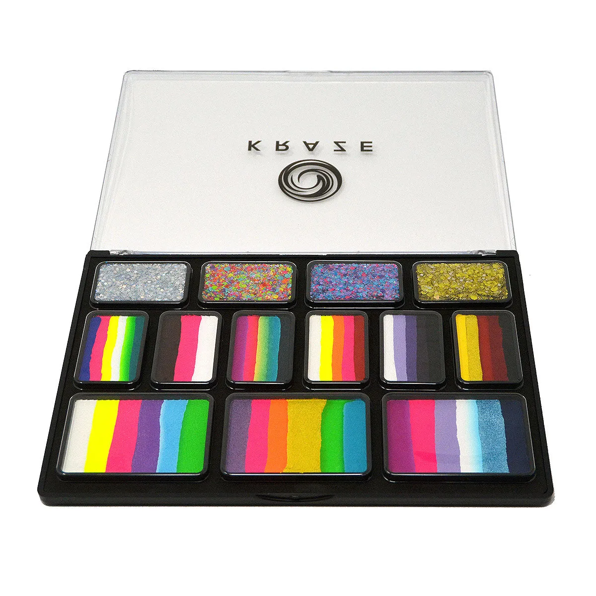Jacqueline loves utilizing high contrast face paint colors in her artistry and she has designed this all-in-one face paint and Vivid Glitter Gleam combo palette for Kraze Fx. With easy-to-blend colors these split-cake combinations are vibrant and versatile. It includes 3 rainbow cakes for larger coverage sponge work and 6 one-stroke split-cakes for brush work. No other palette on the market has Glitter cream in combination with quality face paints as in this unique sleek palette. This exquisite palette is a must have to elevate your face painting artistry!