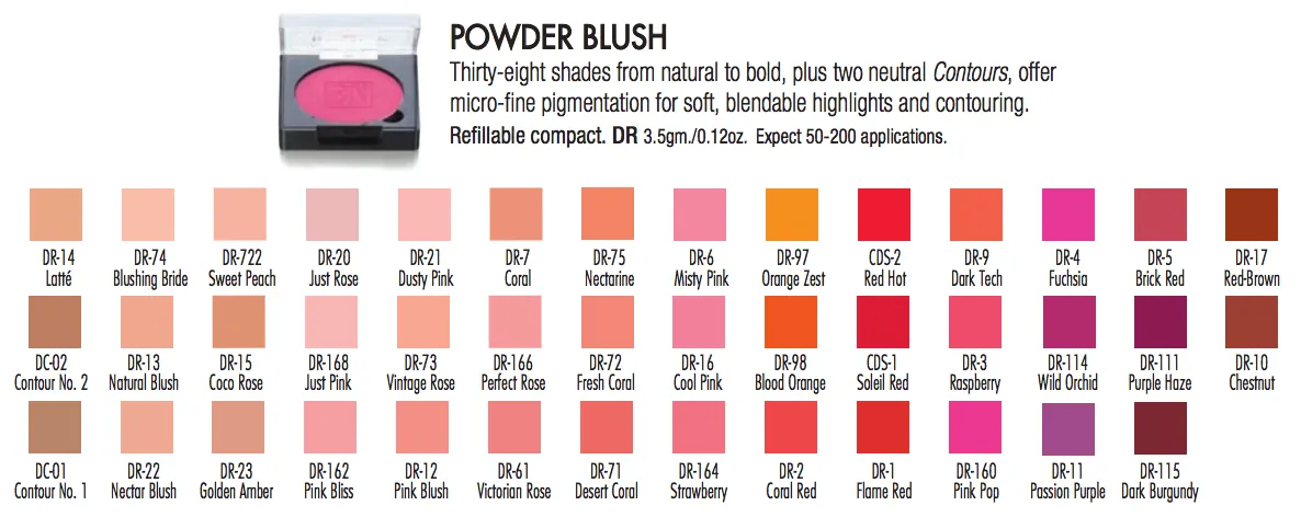 With Ben Nye's ridiculously wide range of colors, you will find the blush color that compliments your skin tone perfectly. Choose from thirty-eight shades ranging from baby pink to deep berry tones to compliment any skin tone. Whether you have a yellow, pink, olive, or neutral undertone, there will be a choice for you. These blushes have an intense color payoff that can be sheered out to perfection, or muted with a . Layer with a contour shade or enhance with a highlight to bring life to your complexion.