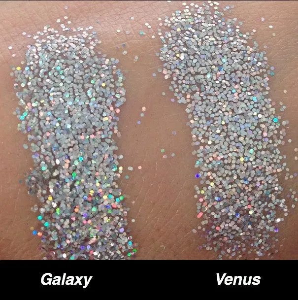 Venus is a white silver with maximum holographic sparkle. This is a full on holographic glitter that shifts rainbow with every turn.